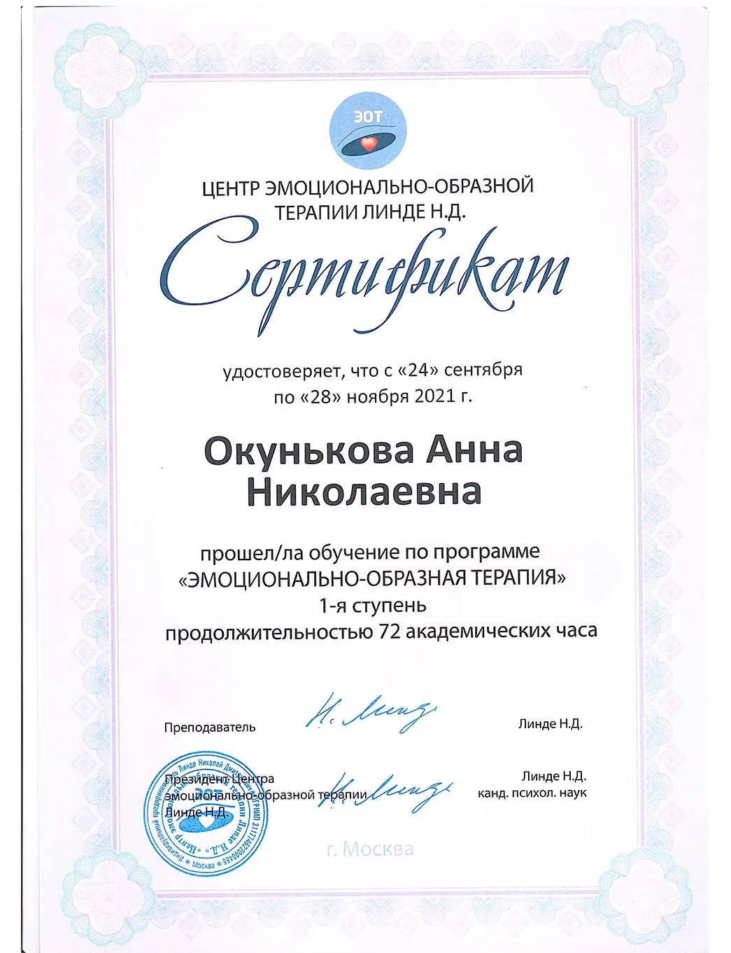 • 2021 - Центр эмоционально-образной терапии Линде Н.Д. (Сертификат о прохождении обучения по программе "Эмоционально-образная терапия")